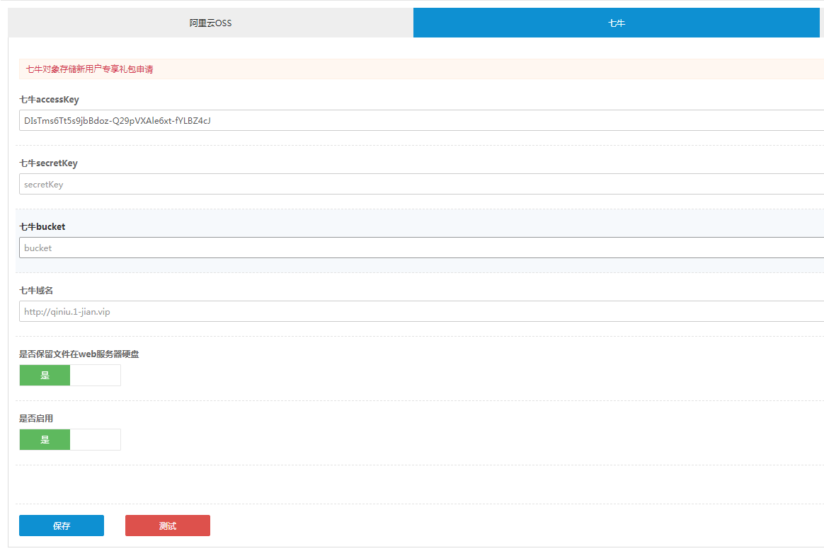 接入要求:1、网站必须已开发七牛接口,有如下设置项:2、有独立域名,且已完成备案,有备案号。3、个人/企业均可。七牛云 - 对象存储介绍:官网:https://www.qiniu.com/ 价格:https://www.qiniu.com/prices/kodo